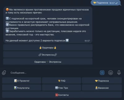 Основная деятельность каппера — платные прогнозы на спортивные события. По описанию понятно, что используется гибридный метод анализа, в котором работа происходит командой капперов с использованием современных технологий. Про это можете почитать в самом боте, подробности о том как они это делают мы описывать не будем.