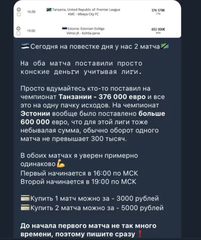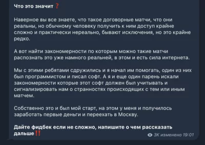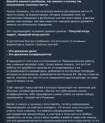 - Большой акцент уделяется тому, что он не занимается организацией или перепродажей этих матчей, в выборе результата он опирается только на свою аналитику и данные полученные с его софта;